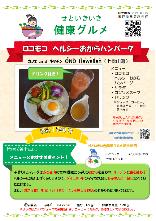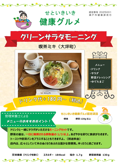瀬戸市では、健康に配慮した食事を提供しているお店のメニューを「せといきいき健康グルメ」として認定しています。外食でも健康的なメニューを食べて、食のQOLを見直しましょう。