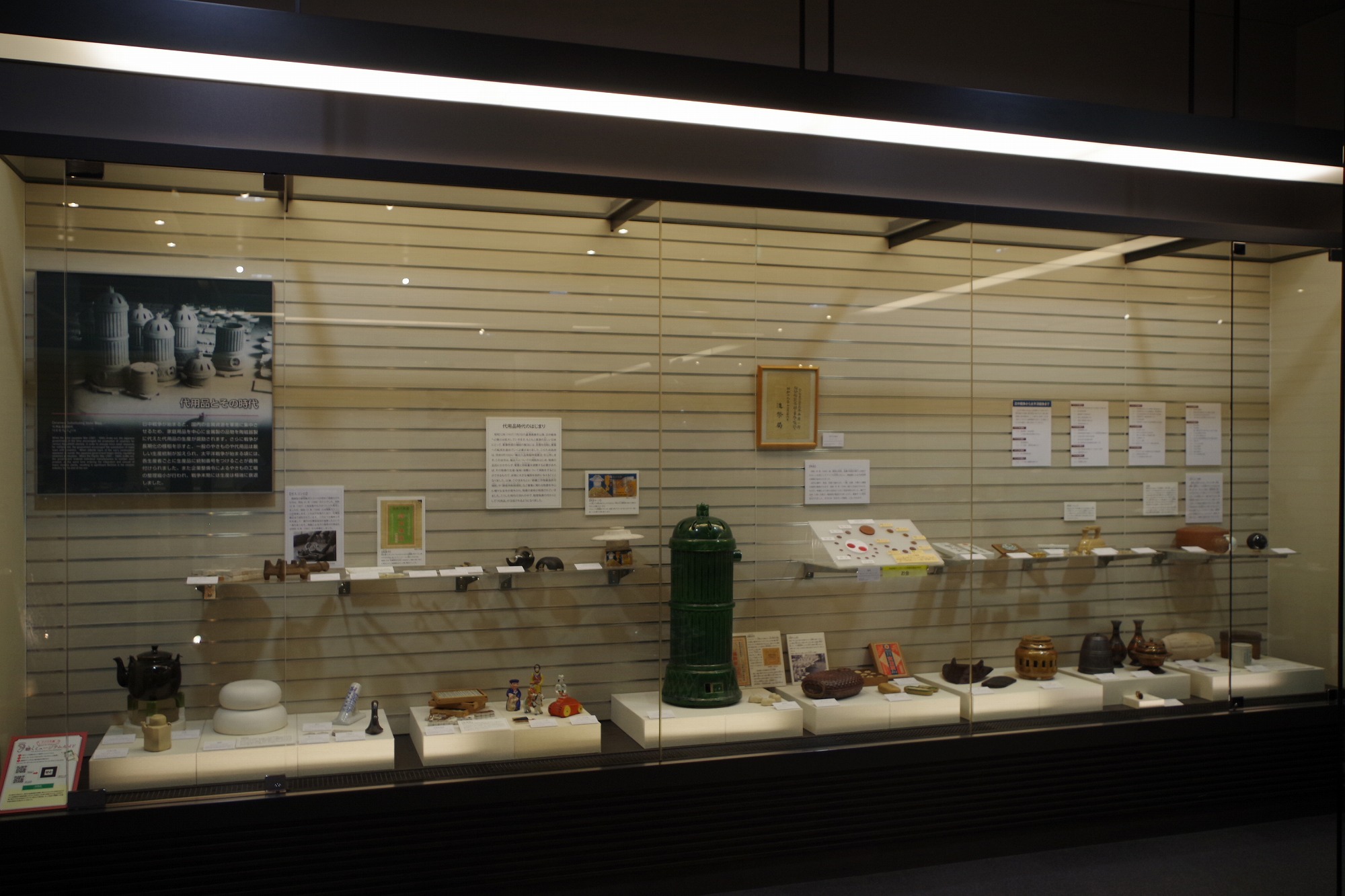 「代用品とその時代」コーナーは、今年終戦80年を迎えることから、様々な種類の当館収蔵の代用品や当時製作されたやきものを展示しました。