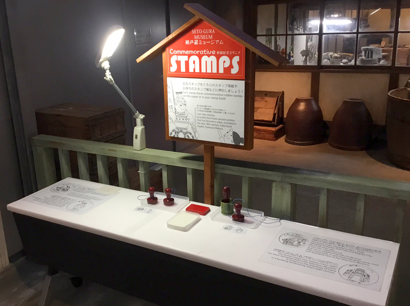 瀬戸蔵ミュージアム入口の「モ754」の前にスタンプコーナーを新設しました。旧尾張瀬戸駅、染付山水図花瓶などのスタンプを設置しています。入館の記念に是非スタンプを押してみませんか。