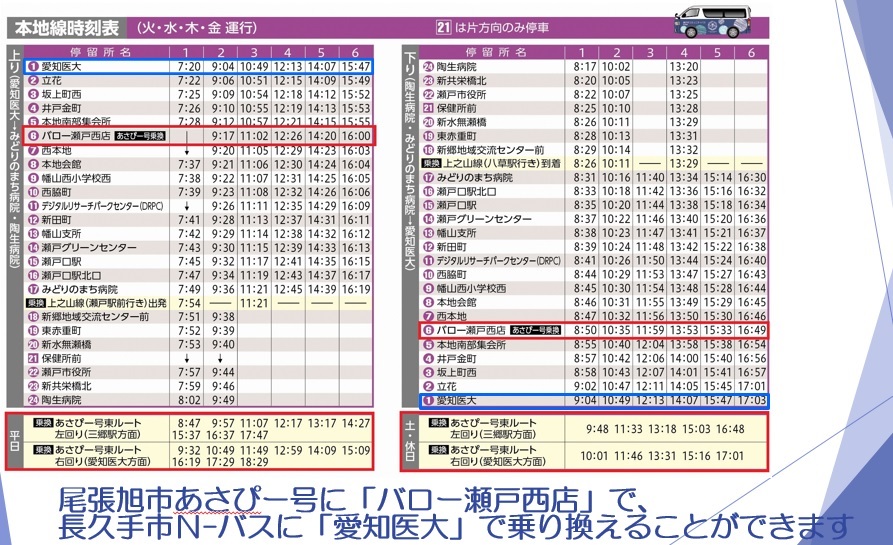 コミュニティバス本地線では、下記のとおり「バロー瀬戸西店」で尾張旭市あさぴー号に、