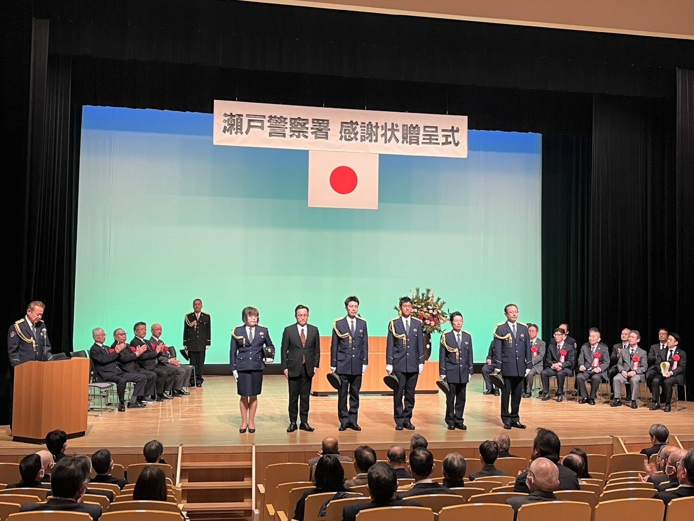 瀬戸蔵つばきホールにおいて、瀬戸警察署感謝状贈呈式が開催されました。安全・安心の実現のため、献身的にご尽力いただいている皆様に改めて深く感謝しました。