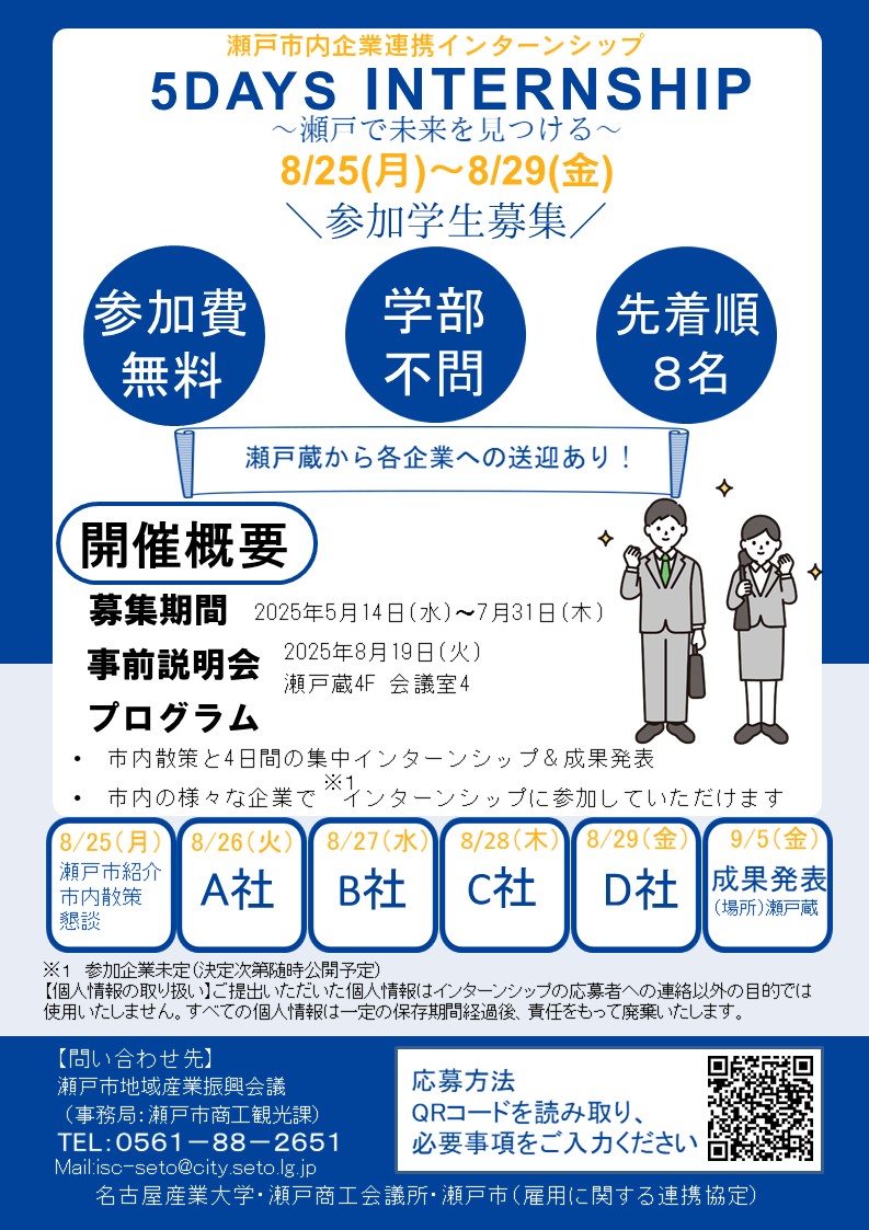 【参加者募集】2025年度 瀬戸市内企業連携インターンシップ 参加学生を募集します!