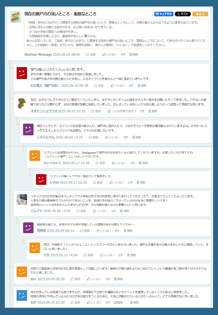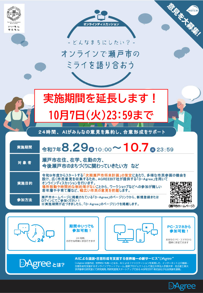 このディスカッションは、期間中、24 時間いつでも投稿できるオンライン空間に集まり、瀬戸市に関する様々なテーマについて意見交換を行うものです。