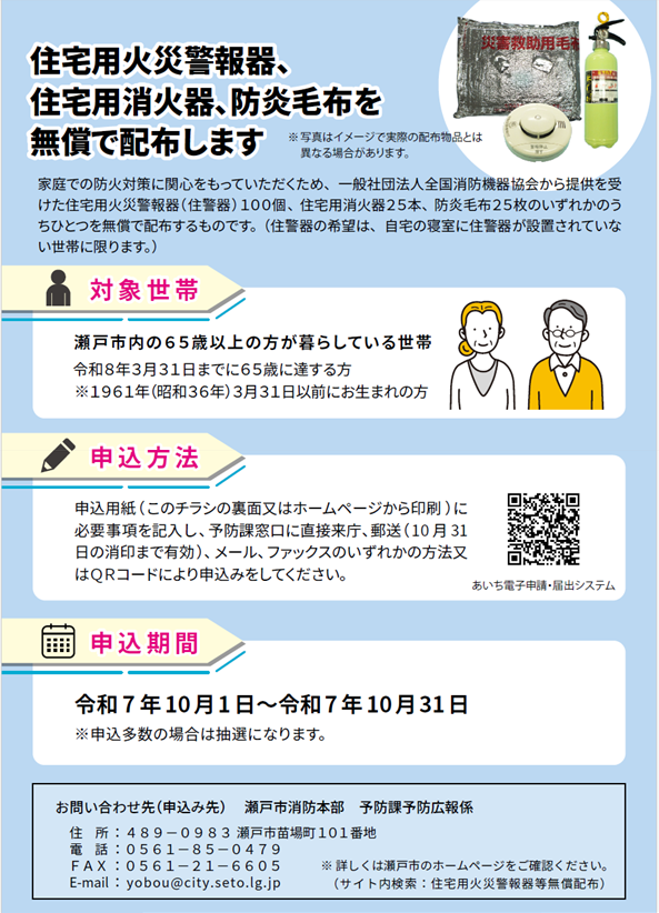 住宅用火災警報器、住宅用消火器、防炎毛布を無償配布!!